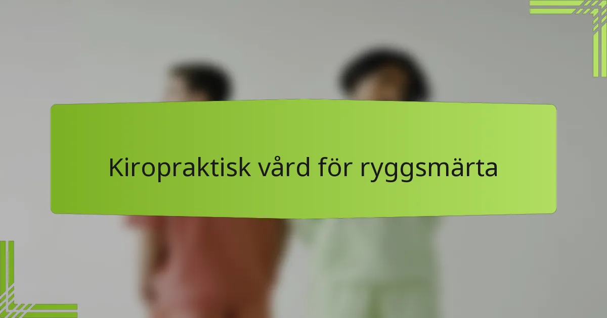 Kiropaktisk vård för ryggsmärta betonar diagnos och behandling av muskel-skelettbesvär, främst genom spinal manipulation. Denna holistiska metod syftar till att lindra smärta och förbättra funktionalitet utan tungt beroende av mediciner eller invasiva procedurer, vilket gör den till ett gångbart alternativ för många individer som lider av ryggsmärta.